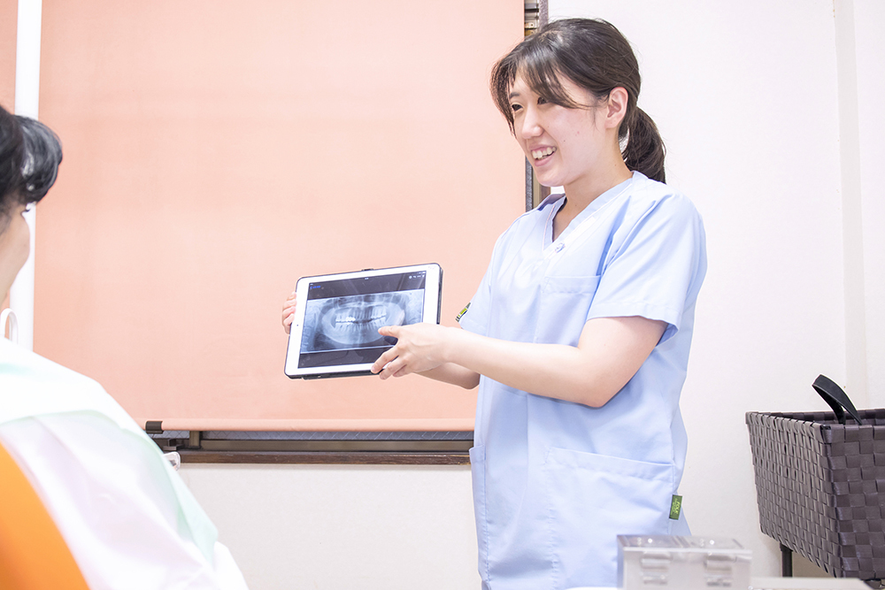 こうした予防ケアを担当するのは歯科助手ではなく、歯科医療の専門職としての国家資格を持つ歯科衛生士です。その専門知識を元に、より効率的な歯磨き方法やデンタルグッズの使い方、健康なお口のための生活習慣などについてアドバイスを実施。豊富な経験を活かし、きめ細やかなケアをご提供しています。